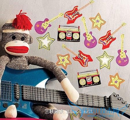 用各种乐器图案装饰音乐工作室的墙面再合适不过了,让这些具有摇滚风格的墙贴点缀白色的墙面,丰富了视觉感的同时,也营造出活泼感十足的室内空间。
