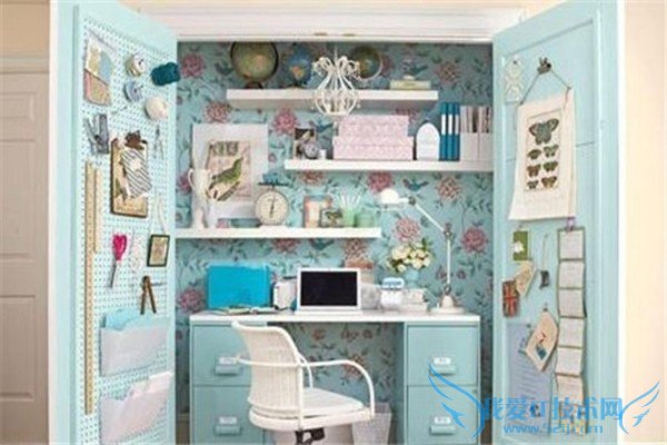 在原本嵌入式衣橱改造成书房,贴上蓝色衬底小花图案的壁纸,刷上同色系的油漆,整体的蓝色氛围使小清新的感觉扑面而来。在里层做些搁板,是收纳物品的良好场所。