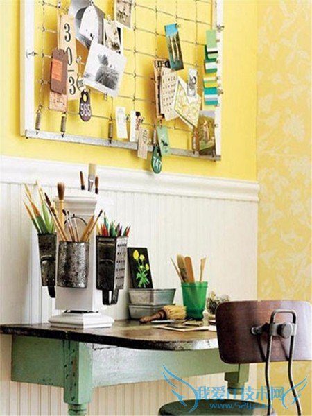 只需要在空闲的墙面上架起一个小桌子,就能形成一个工作区域。三个笔筒的设计,让大量画笔的收纳不在烦恼。上方宛如球门的网格设计,可以夹上照片,亦然成为一个背景墙装饰。