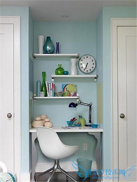 即使两扇门中只有几点点的空间,也能把它利用起来作为书房。三个搁架的处理,既起到了收纳的作用,又能起到展示的作用。再放上一个挂钟,让你能时刻掌握时间。