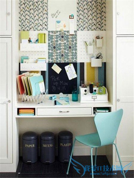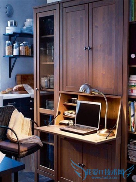 你有没有想到,即使厨房也能划出区域作为小书房。在碗橱中的可收缩版上,放上一台电脑,一旁的小空间也不放过,安装三个搁板,让小东西也有收纳之所。