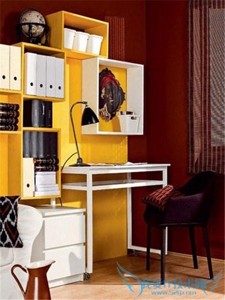 利用客厅放上一把小桌子和椅子,就自然地形成了书房。墙面上方形的置物架,将多个文件夹都收纳其中,十分方便。在整体黄色墙面上点缀着白色文件夹,使这个客厅书房显得十分明快。