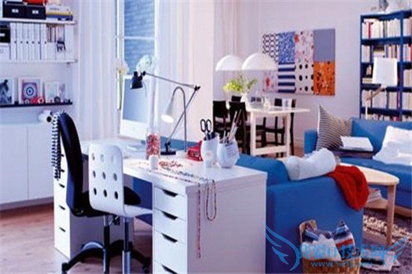 在客厅长沙发的背面放上一个写字台,就能在客厅形成一个小书房。白色的书桌和蓝色的沙发,使整个空间显得宁静而悠远。