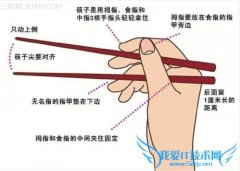 图中解析了五指握筷子的具体姿势,共有7个要领,分别是:1、手握筷子前,要先将两根筷尖对齐;2、使用时只动筷子上侧;3、使用拇指、食指和中指3根手指头轻轻将筷子拿...