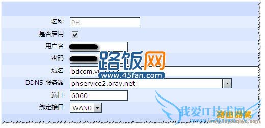 4、申请完域名后,将申请到的域名填入域名框中。我们有了DDNS服务,可以基于ADSL的动态IP地址完成服务器建站、VPN组网等功能。
