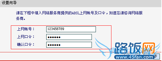 4.会进入ADSL上网账号和口令界面,此时主要按要求输入你的账号和密码就ok了。