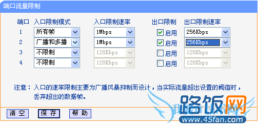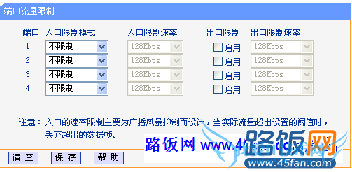 4、tl-r4149路由器共四个端口,可分别设置为不同网段。在“端口流量限制”界面下,可对某一端口限制速率,具体设置如下图所示:
