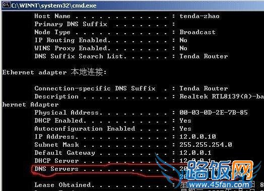 以上如果都正常还是不能打开internet网页,请查看计算机的DNS地址是否与 路由器运行状态里面的域名服务器一致。(计算机IP与DNS地址必须是自动获 取的,如果不是,请指定为正确的IP与DNS地址)在运行栏输入cmd,进入DOS提示符,输入ipconfig /all 回车,将看到如下画面。
