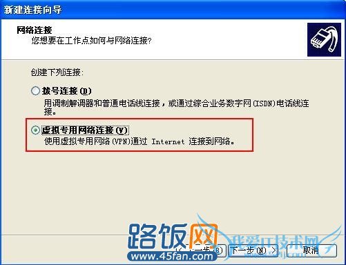 (3)点击下一步,选择“虚拟专用网络连接”。