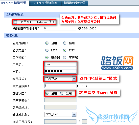 2、开始配置PPTP 服务器:启用VPN-to-Internet通道,填写总部VPN服务器拨号需认证用户名及密码。