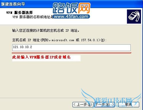 (4)点击下一步,在“VPN服务器选择”里输入所需VPN服务器的IP地址或者域名,然后点击“下一步”,再点击“完成”即可。