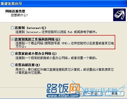 (2)在新建连接向导下,选择“连接到我的工作场所的网络”。