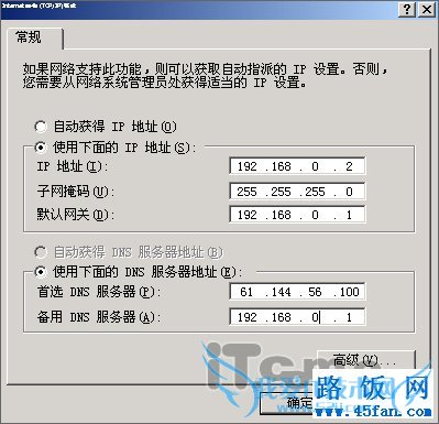 由于路由器的IP段是192.168.0.1,所以电脑的IP也要设置为相同的IP段,下面设置为192.168.0.2,子掩码一般都是 255.255.255.0,而网关肯定是需要指向路由器的IP,因此设置为192.168.0.1。DNS中有所不同,按不同的宽带类型与运营商的 DNS填写,因路由器中可设置DNS,这里不填或者直接填192.168.0.1路由器的IP也行。填完直接按确认,完成!