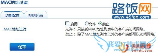 启用此功能,并将开关选择“禁止”,表示除了MAC地址列表以外的客户端都可以访问网络。