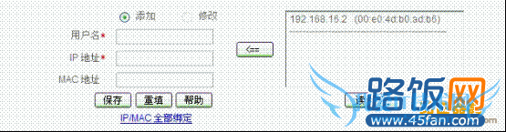 一、 首先在“高级配置”—“IP/MAC绑定”页面,将需要禁止上网的指定的PC做IP/MAC绑定,以固定电脑IP。