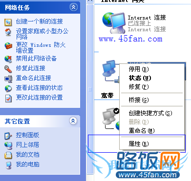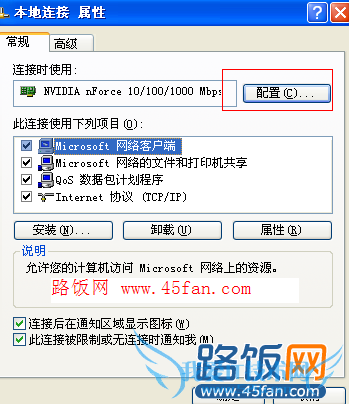 1、右击网上邻居属性,然后进入“本地连接”并右击属性,进入网卡设置项,如下图所示: