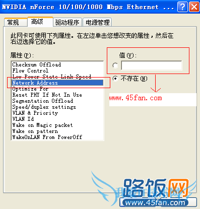 3、在Network Address右边,可设置需要的MAC地址。默认值为“不存在”,如下图所示: