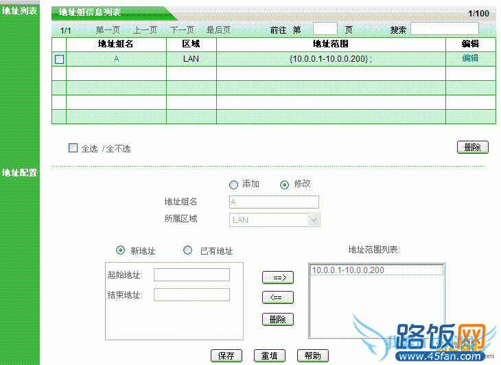 1、“webui—防火墙—地址组”建立地址组A(PPPOE服务器设置的地址,假设池起始10.0.0.1,数量200)如下图: