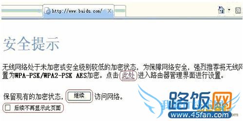 2. 如果当前无线设置加密类型为非WPA-PSK/WPA2-PSK AES 加密,您打开网页时会弹出如下界面。