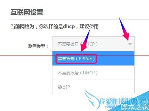 4、打开互联网设置,点击右边的下拉菜单,选择上网模式为拨号PPPoE方式