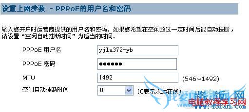 5、输入宽带用户名和密码;mtu不动;自动空闲挂断时间设为0,既永远在线.点击“下一步”: