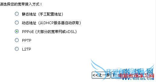 4、选择宽带接入方式:pppoe,继续点“下一步”: