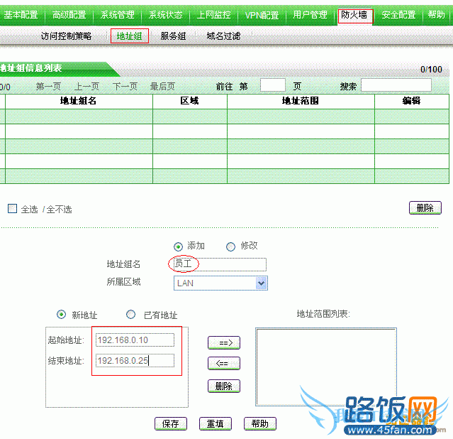 2.到WEBUI->防火墙->地址组页面做好地址组名称为员工的地址组:192.168.0.10-25。
