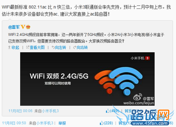 无独有偶,11 月 8 日,小米董事长雷军在微博上表示,小米2A/小米3/小米电视/新小米盒子已支持双频 Wi-Fi,但需要支持双频的路由器配合,还问网友们换了双频路由器了没有。对此,我们也不难猜测,小米对于路由器市场也是蠢蠢欲动了,毕竟前有小米盒子的推出,现在再顺势推出一款路由器,也并非是什么意想不到的事。