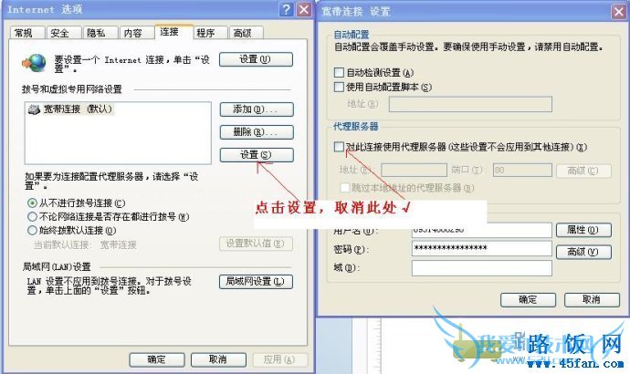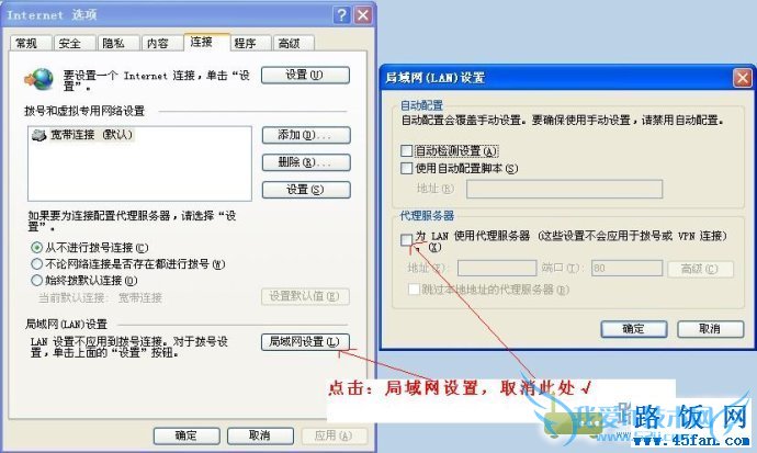 打开IE浏览器---工具--internet选项--连接选项卡--选择默认的网络连接,点设置---去除“对此连接使用代理服务器”的勾选(点击局域网设置:取消为LAN适用代理服务器),然后点确定,重启IE浏览器就行了(最好能够重启电脑)。具体操作如下图所示: