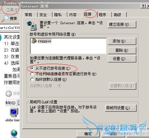 在IE栏中有个工具选项,单机打开,现在intelnet选项——连接——从不进行拨号连接 ——确定就可以了,如图: