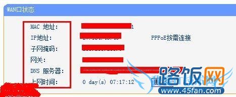 在路由器的wan状态栏下找到MAC地址,IP地址等信息并将其复制把这些信息复制下来,然后我们就看到了路由器的dns服务器信息,当然网关的信息也有。如下图所示;