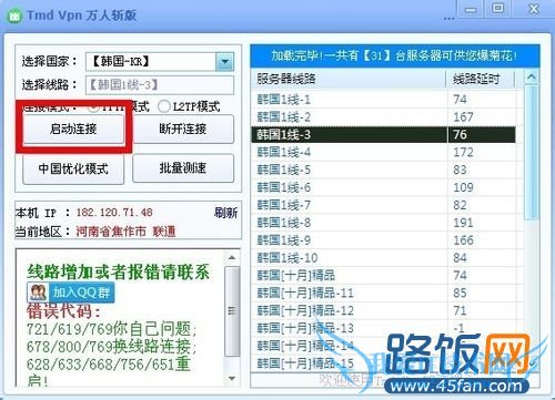 3、线路启动后,VPN软件会自动显示当前公网IP地址,如下图所示,IP地址182.120.71.48,地区:河南省焦作市联通