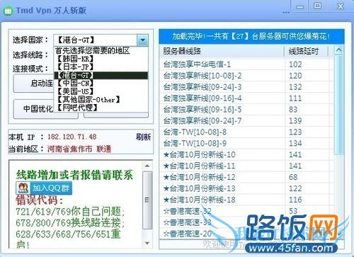 1、先从网上下载万人斩VPN软件,安装并运行它。然后选择线路,比如港台-GT或中国-CN,如下图所示: