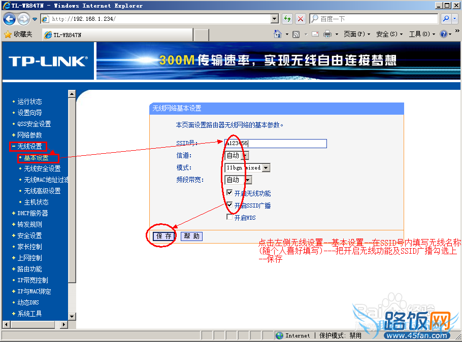 4、拨号上网设置完成后,接下来就是设置无线上网了,很简单,点击无线路由器左侧的“无线设置”》“基本设置”,只需开启无线功能及SSID广播,SSID号随意命名,点击保存即可。如下图所示: