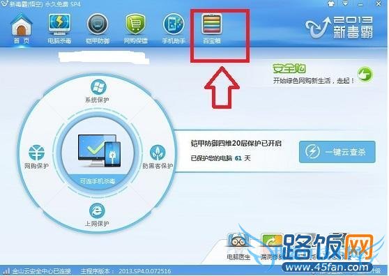 要找到金山毒霸(悟空)中自带的Wifi共享功能,我们只需要打开金山毒霸,然后点击进入“百宝箱”,如下图所示:
