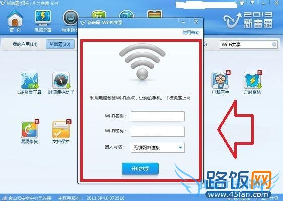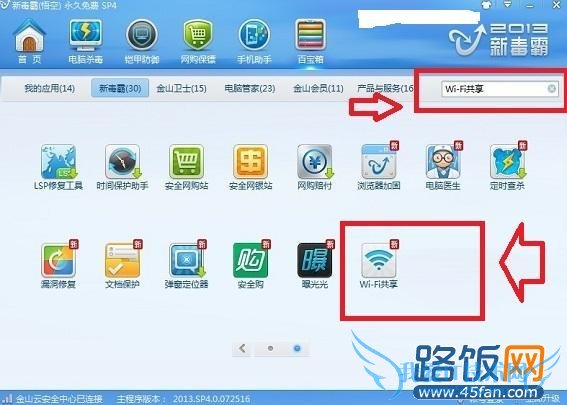 随着智能手机、平板电脑等对Wifi无线网络需求的激增,目前网上有很多工具软件,无需购买路由器即可实现将笔记本变身为Wifi无线热点。目前已经有不少相关类似的工具,如Wifi共享精灵、新毒霸Wifi共享等等。其中金山毒霸的Wifi共享是新推出的一项功能,但很多安装了金山毒霸的朋友都不知道新毒霸Wifi共享在哪,也不知道如何使用,接下来路饭网小编与大家介绍下。