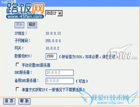 ⑥需要说明的是,设置为“动态IP”后,可在“WAN口设置”中“更新”或“释放”您从ISP的DHCP服务器那里获得的IP地址、子网掩码、网关、DNS服务器信息。而且在这里您还可手动设置您需要设置的DNS服务器。此外,如果你在网络连接正常的情况下无法获取IP地址,可能是由于一些ISP的DHCP服务器不支持广播的请求方式,可以在此项中选择“单播方式获取IP”试试。