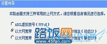 ⑤在IE地址栏中输入无线宽带路由器的WEB配置IP地址(参看说明书),如192.168.1.1,然后输入用户名和密码,进入无线宽带路由器的配置界面。在无线路由器的设置页面中在“设置向导”中选择“动态IP(以太网宽带,自动从网络服务商获取IP地址)”,再一路“Next(下一步)”之后,便可多机共享无线宽带路由器上网。