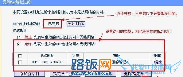 3、点击“添加新条目”,在MAC地址栏中输入需要过滤的无线MAC地址,描述可以自定义,状态开启即可。