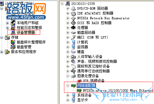 如何知道无线网卡安装是否成功:右击我的电脑---管理,进入计算机管理界面并点击设备管理器,在右边的设备硬件界面的网络适配器中可知道无线网卡是否安装成功。如下图所示: