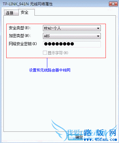 4. 安全类型、加密类型、网络安全密钥设置和无线路由器中相同。