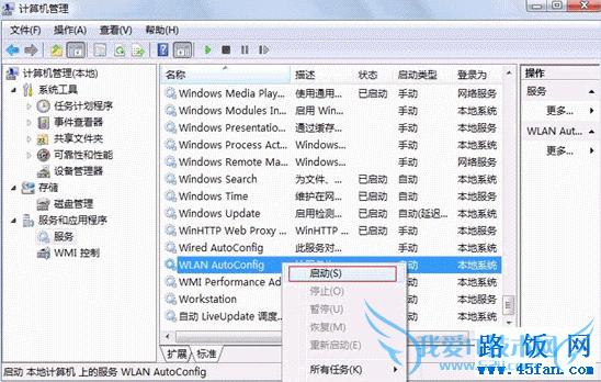 2. 选择“服务和应用程序”中的“服务”,在右边列表中找到“WLAN AutoConfig”,右键选择“启动”。