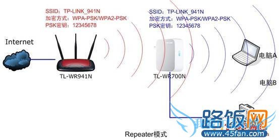 Repeater即中继模式,Bridge即桥接模式。Repeater模式下,无线路由器广播的SSID号及加密方式与主AP是完全一致的,故而采用Repeater模式后无线就搜索不到无线路由器的默认SSID了。而采用Bridge模式,无线路由器可以自行设定无线信号的SSID及加密方式,可以与主AP不同。 无线路由器设置Repeater模式,作为前端无线设备的中继放大,首先与主AP建立无线连接,接着将主AP的无线信号发送出去,如下图所示: