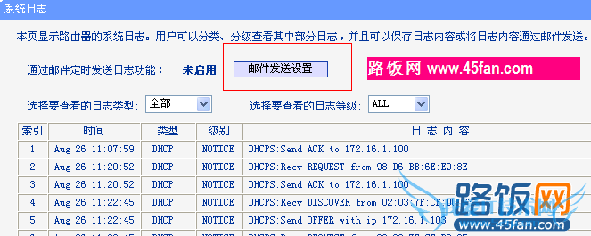 3、在右侧的系统日志框下,可查看日志类型及当前日志内容,点击“邮箱发送设置”,如下图所示: