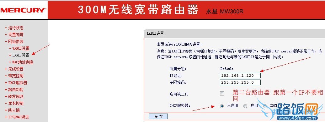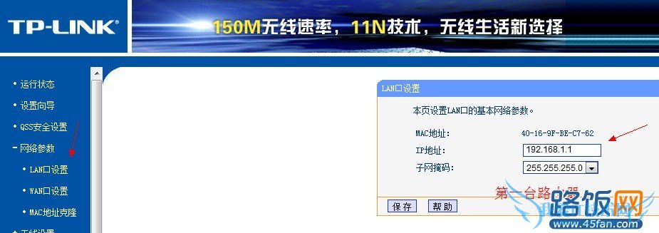 3、设置第二台路由器。这里主要是设置一下第二台路由器的IP地址跟第一台不要相同,否则就会冲突。第二无线路由器连接好之后,在浏览器地址栏里输入192.168.1.1,输入路由器的用户名和密码,一般都是admin。登录第二台路由器后台之后,找到右侧的网络参数,选择LAN设置,把这里的IP地址换一下跟第一个不相同就可以了。另外,就是把这里的DHCP服务器选择不启用。