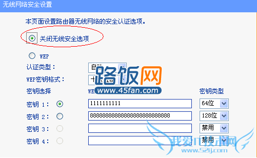 3、点击“无线设置》无线安全设置》关闭无线安全选项。如下图所示: