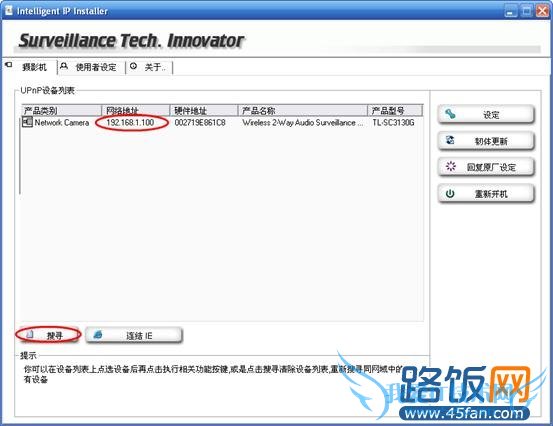 步骤一:搜索IP Camera的管理IP地址。安装产品附带光盘中的Intelligent IP Installer软件,并按图示有线连接搜,寻到其管理IP地址(如果您已经获取了IP Camera的IP地址,此步可以跳过)