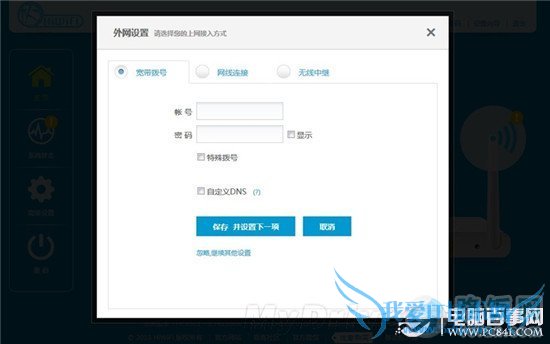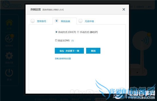 第一步便是设置上网方式,有“宽度拨号”“网线连接”和“无线中继”三种外网连接模式。