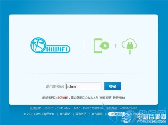 同意后,进入极路由的后台,默认密码为admin,建议大家登录后马上修改密码。