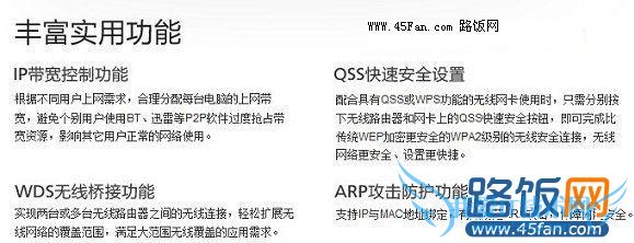 目前比较好的无线路由器都带有IP宽带控制、WDS无线桥接、QSS快速安全设置以及ARP攻击防护等高级功能。其中我们比较常用的是路由器IP宽带控制,该功能可以帮助我们更好的合理分配网络,保证每一个上网用户都可以合理的分配到网络资源。避免个别用户使用BT、迅雷等P2P软件过度抢占带宽资源,影响其它用户正常的网络使用。